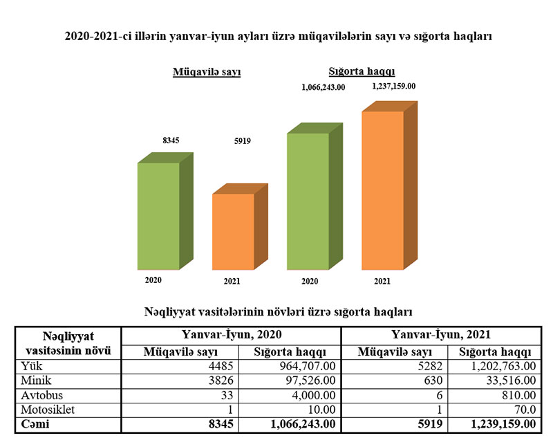 İcbari Sığorta Bürosunun yaydığı məlumata görə, 2021-ci ilin müvafiq dövründə isə 5919 sığorta müqaviləsi rəsmiləşdirilmiş və həmin müqavilələr üzrə 1 milyon 237 min 159 manat sığorta haqqı toplanmışdır. 6 aylıq nəticələr bağlanan sığorta müqavilələrinin sayında 29% azalma, sığorta haqlarında isə 16% artımın olduğunu deməyə əsas verir.