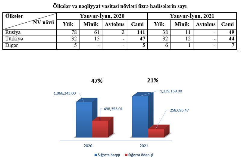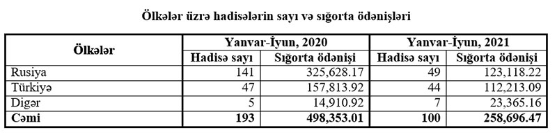 2020-ci ilin yanvar-iyun ayları ərzində 193 yol nəqliyyat hadisəsinə görə 498 min 353.01 manat, 2021-ci ilin müvafiq dövründə isə 100 yol nəqliyyat hadisəsinə görə 258, min 96.47 manat sığorta ödənişi həyata keçirilmişdir.