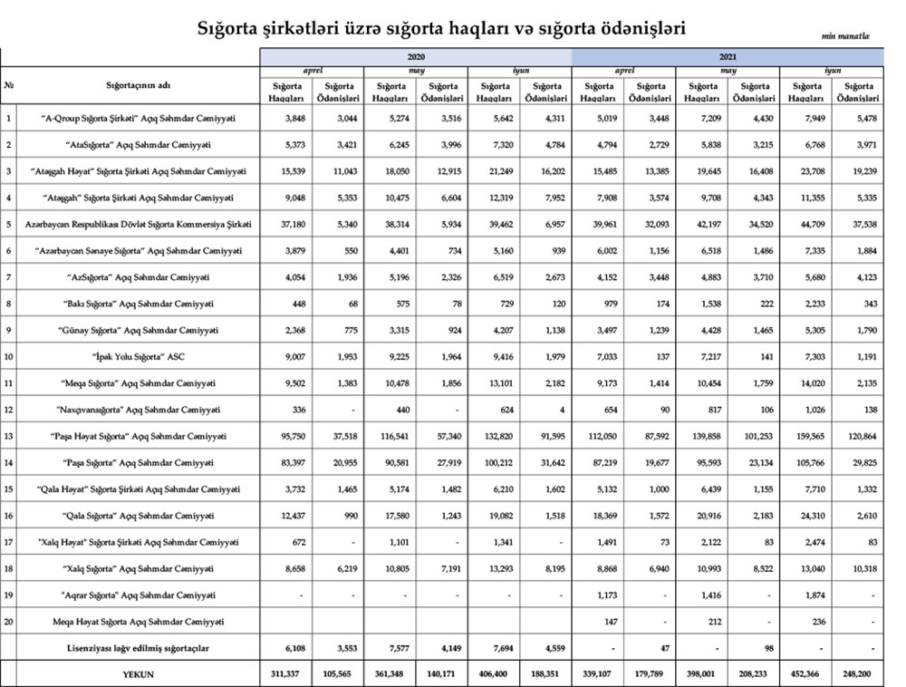 Bu ilin yanvar-iyun aylarında Azərbaycanda fəaliyyət göstərən sığorta şirkətləri tərəfindən 452 milyon 366 min manat məbləğində sığorta haqqı hesablanıb.