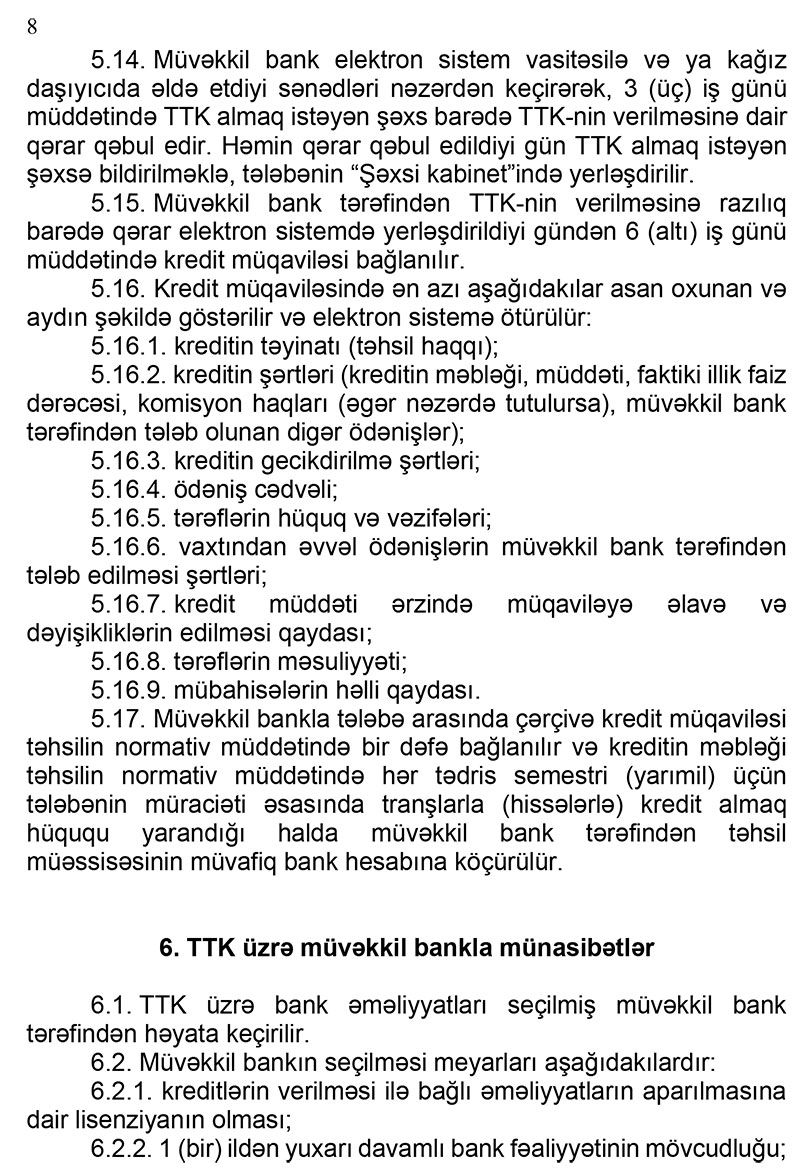 - tələbə - ona aid gəlirlərin, xərclərin, əmlakların və digər zəruri fərdi məlumatların kredit müqaviləsinin qüvvədə olduğu müddətdə aidiyyəti dövlət orqanları və təşkilatları tərəfindən Fondun və müvəkkil bankın sorğusu əsasında ona (onlara) təqdim edilməsinə və muzdla və ya mülki-hüquqi xarakterli müqavilələrlə işlədikdə və ya sahibkarlıq fəaliyyəti ilə məşğul olduqda alacağı əməkhaqqından və ya əldə edəcəyi gəlirdən TTK-nin qaytarılması məqsədilə müvəkkil bankın xeyrinə tutulmaların (gəlirin 20 faizindən çox olmamaq şərtilə) edilməsinə.