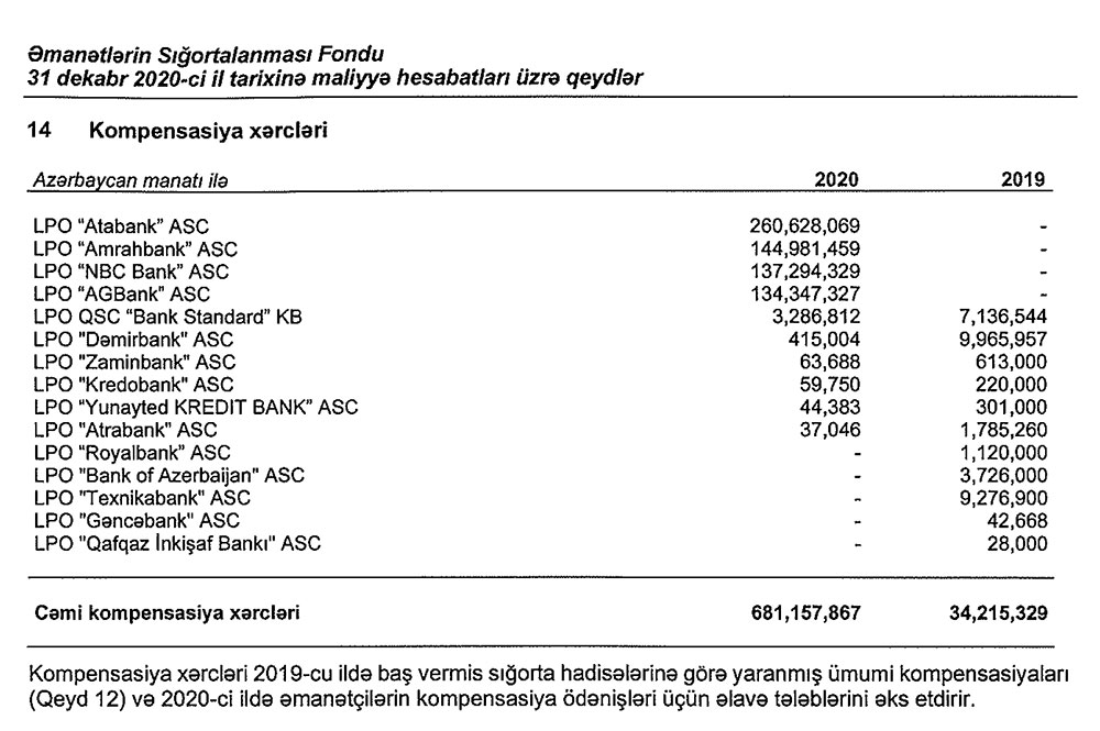 2020-ci ilin sonuna olan məlumata görə, Əmanətlərin Sığortalanması Fondu ləğvetmə prosesində olan banklara 148 milyon manata yaxın vəsait ödəməlidir.