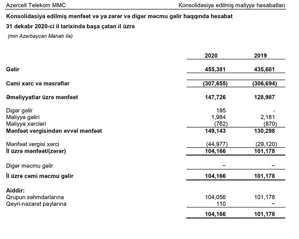 Müqayisə üçün qeyd edək ki, 2019-cu ildə "Azercell Telekom"un cəmi əməliyyat gəlirləri 437 milyon 862 min manat, cəmi əməliyyat xərcləri 307 milyon 564 min manat, əməliyyat mənfəəti 130 milyon 298 min manat, ödədiyi mənfəət vergisi 29 milyon 120 min manat təşkil etmişdi.