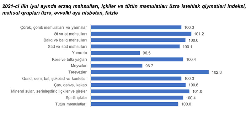 2021-ci ilin iyul ayında ərzaq məhsulları, içkilər və tütün məmulatları üzrə istehlak qiymətləri indeksi əvvəlki aya nisbətən 0,3 faiz, əvvəlki ilin iyul ayına nisbətən 6,4 faiz təşkil etmişdir.