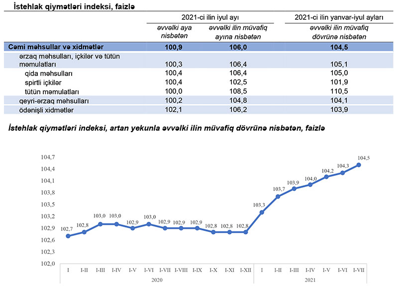 2021-ci ilin yanvar-iyul aylarında istehlak qiymətləri indeksi (inflyasiya göstəricisi) 2020-ci ilin yanvar-iyul aylarına nisbətən 4,5 faiz, o cümlədən ərzaq məhsulları, içkilər və tütün məmulatları üzrə 5,1 faiz, qeyri-ərzaq məhsulları üzrə 4,1 faiz, əhaliyə göstərilmiş ödənişli xidmətlər üzrə 3,9 faiz artıb.