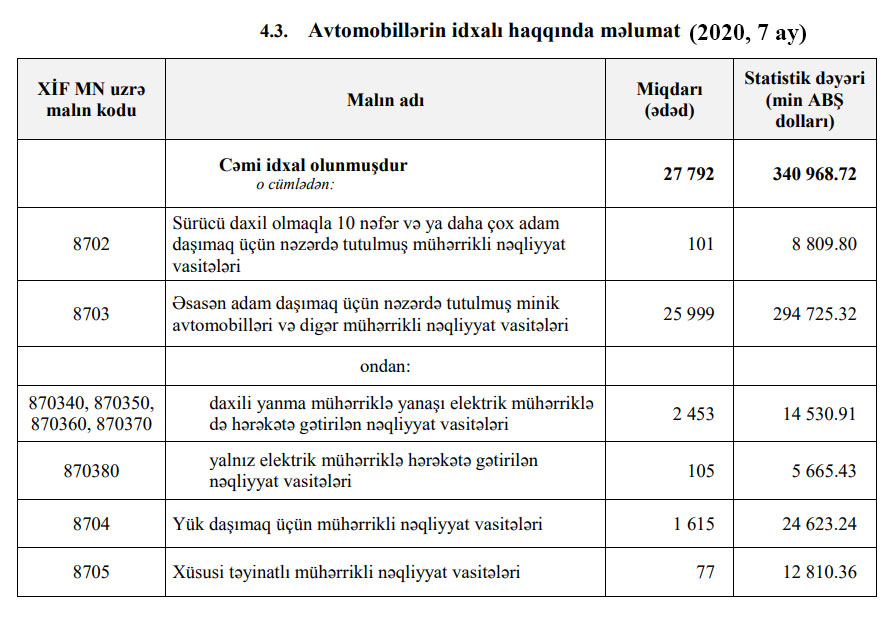 Qeyd edək ki, 2020-ci ilin yanvar-iyul aylarında Azərbaycana 340 milyon 968 min dollar dəyərində 27 min 792 ədəd avtomobil idxal edilmişdi.