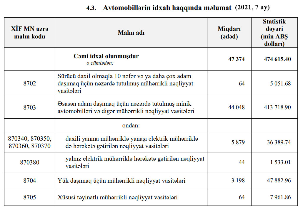 2021-ci ilin yanvar-iyul ayları ərzində (7 ayda) Azərbaycana 474 milyon 615 min dollar dəyərində 47 min 374 ədəd avtomobil (nəqliyyat vasitələri) idxal edilib.