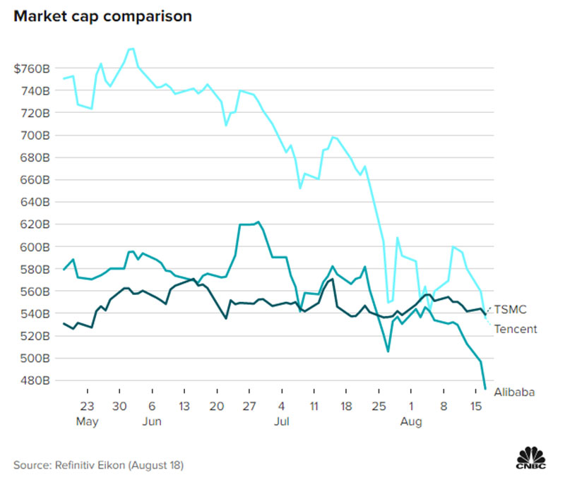 Nəticədə bazar dəyərləri sürətlə azalan nəhənglər liderlik yarışında Tayvan şirkəti, dünyanın ən iri yarımkeçiri çip istehsalçısı TSMC-yə (Taiwan Semiconductor Manufacturing Company) uduzublar. Avqustun əvvəlindən etbarən TSMS-nin bazar dəyəri 538 milyard dollar, əvvəlki lider Tencent-in kapitallaşması 536 milyard dollar, Alibaba-nın bazar dəyəri isə 472 milyard dollar təşkil edib.