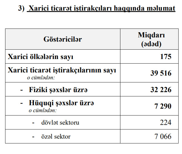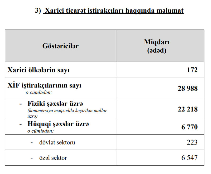 Qeyd edək ki, 2020-ci ilin 12 ayı ərzində xarici ticarət iştirakçılarının sayı 45 min 462, o cümlədən fiziki şəxslərin sayı 37 min 211, hüquqi şəxslərin sayı 8 min 251 olmuşdu.