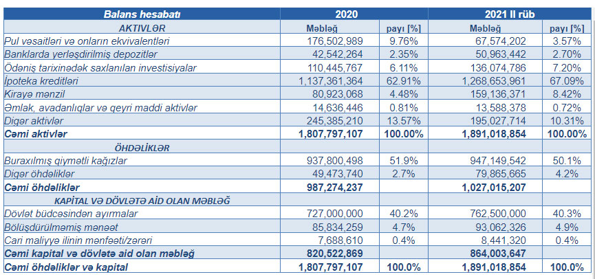 30 İyun 2021-ci il tarixində İpoteka və Kredit Zəmanət Fondu 1 milyard 891 milyon 19 min manat cəmi aktivlərə malik olub, o cümlədən aktivlərin 1 milyard 268 milyon 654 min manatını ipoteka kreditləri, 159 milyon 136 min manatını kirayə mənzillər təşkil edib.