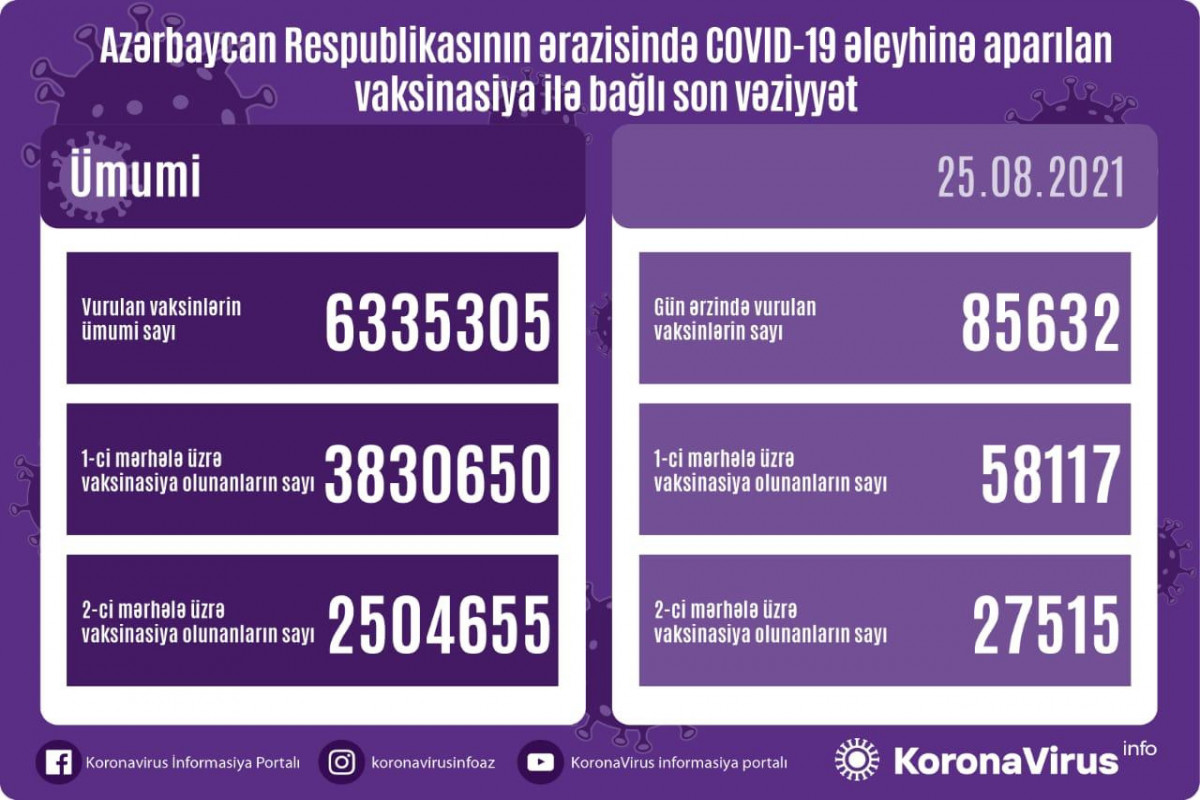 Ölkədə vurulan vaksinlərin ümumi sayı 6335305, birinci mərhələ üzrə vaksinasiya olunanların ümumi sayı 3830650, ikinci mərhələ üzrə vaksinasiya olunanların sayı isə 2504655 təşkil edir.