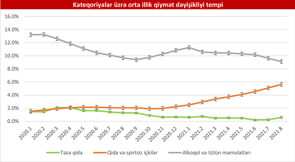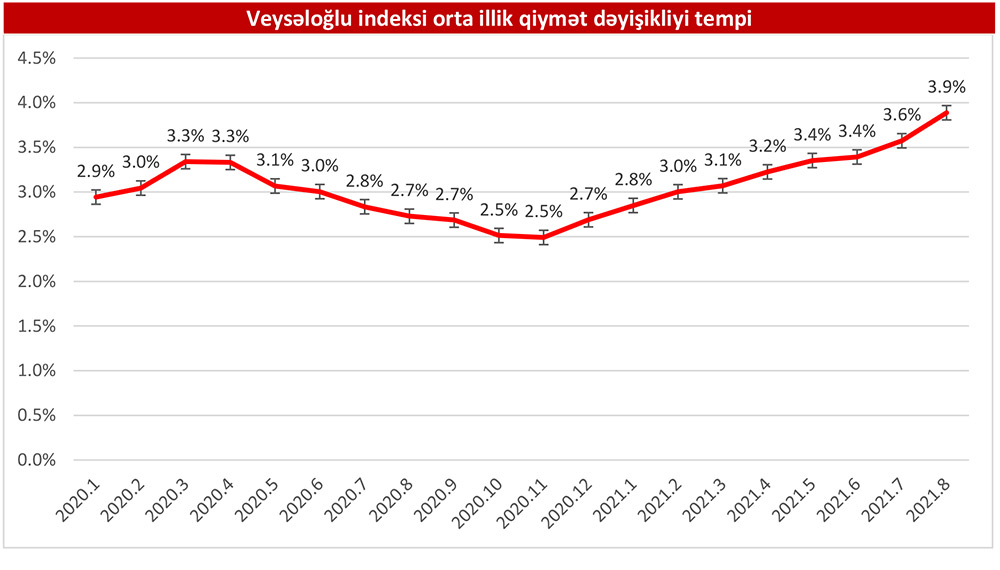 “Veysəloğlu Pərakəndə İndeksi”-nə daxil edilən məhsulların qiymətində 2021-ci ilin avqust ayında 2020-ci ilin avqust ayı ilə müqayisədə 6,1% artım müşahidə edilir. Belə ki, cari ilin avqust ayında ötən ilin avqust ayı ilə müqayisədə təzə qida məhsullarında (qısa müddətli istifadəyə yararlı istehlak məhsulları) 4,0%, qida və spirtsiz içkilərdə 8,5%, alkoqol və tütün məmulatlarında isə 5,6% artım olub.