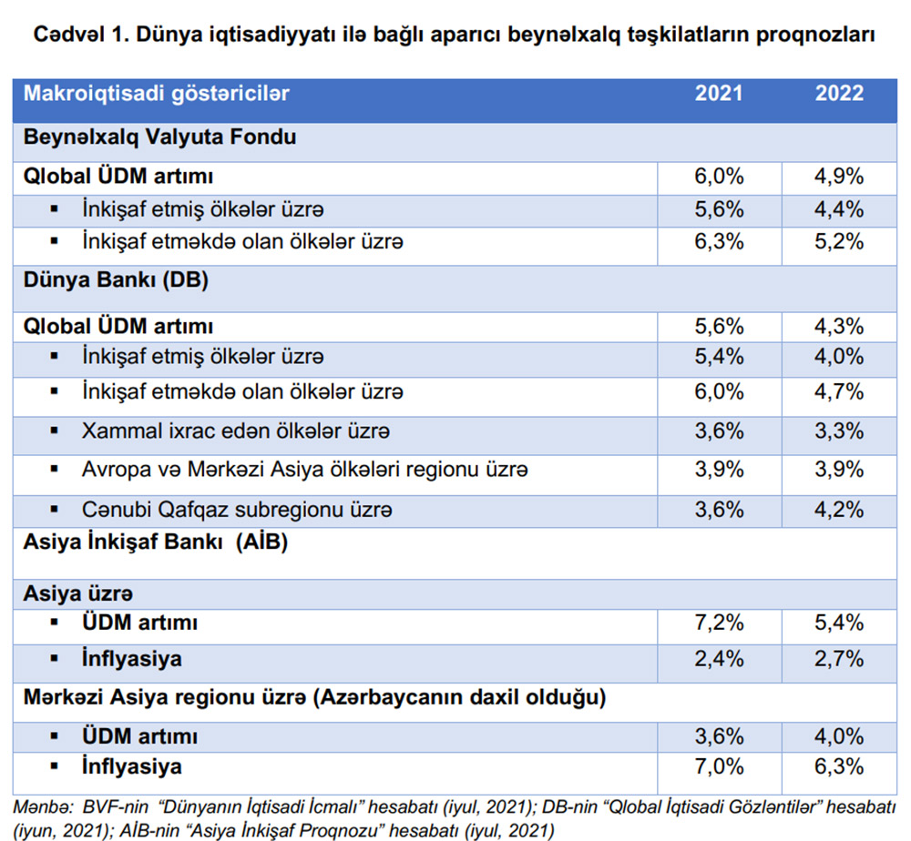 Proqnozlara əsasən, ortamüddətli dövrdə iqtisadi artım templərinin bərpa edilməsi ilə ölkədə ÜDM-in həcminin 2022-ci ilin sonuna 87,5 milyard manat, 2025-ci ildə isə 102,6 milyard manata qədər artacağı gözlənilir.