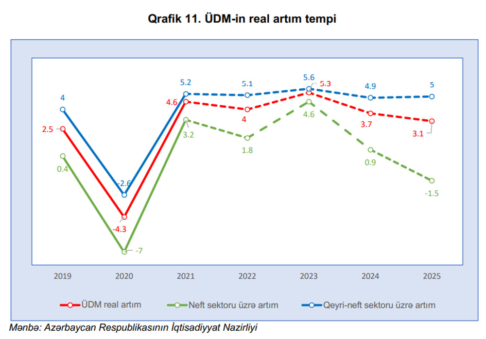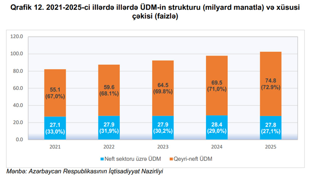 Açıqlamada bildirlir ki, iqtisadiyyatın diversifikasiyasının genişləndirilməsi növbəti illərdə də əsas strateji iqtisadi prioritetlərdən biri olmağa davam edəcəkdir. İqtisadi artımın əsas hərəkətverici qüvvəsinin neft sektorundan qeyri-neft sektoruna transformasiya olunması sayəsində dövlət büdcəsində qeyri-neft gəlirlərinin payının davamlı artımına nail olunacağı gözlənilir. 2025-ci ildə ÜDM-in tərkibində qeyri-neft sektorunun payının 72,9 faizə, neft sektorunun payının isə 27,1 faizə bərabər olacağı proqnozlaşdırılır.