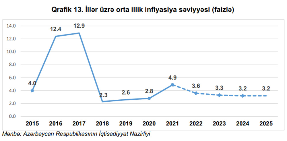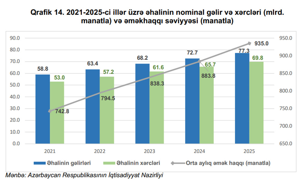 Eyni zamanda, inflyasiya səviyyəsinin tənzimlənməsi ortamüddətli dövrdə əhalinin sosial rifah göstəricilərinə də müsbət təsir göstərəcəkdir. Proqnozlara əsasən növbəti il və sonrakı üç ildə əhalinin gəlirlərinin artaraq 2025-ci ildə 77,3 milyard manata, xərclərinin isə 69,8 milyard manata qədər yüksəlməsi proqnozlaşdırılır.