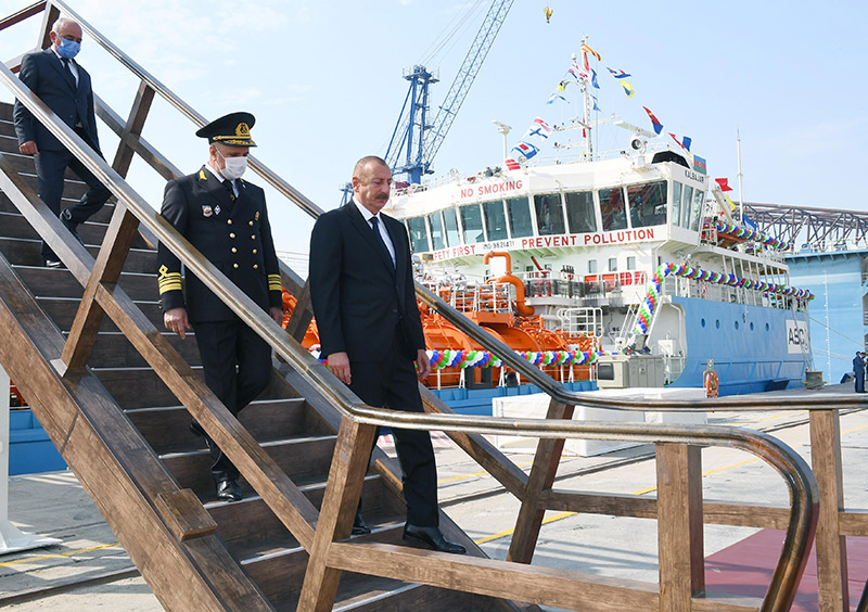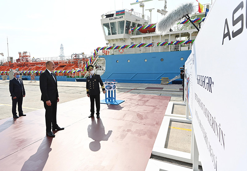 Dövlətimizin başçısı tankerin istifadəyə verilməsini bildirən rəmzi lenti kəsib.
