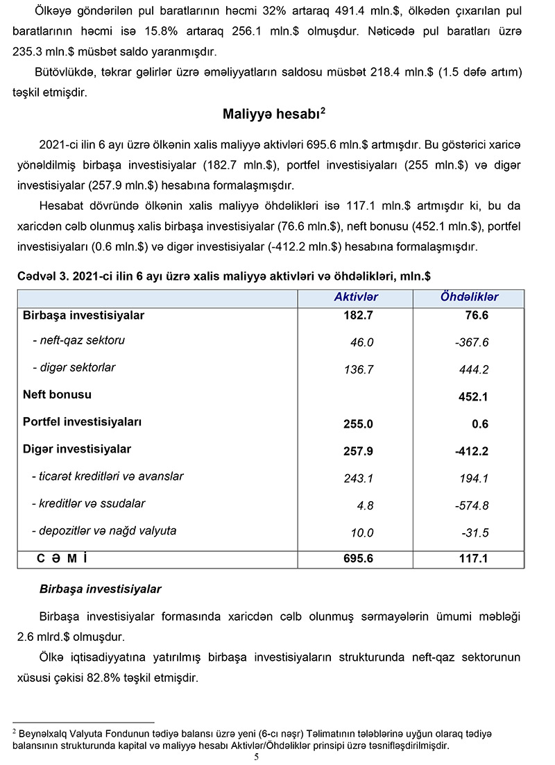 2021-ci ilin 1-ci yarımilliyində Azərbaycanın tədiyyə balansında 1,3 milyard dollar artıqlıq (profisit) yaranıb. Halbuki, 2020-ci ilin eyni dövründə 956,4 milyon dollar kəsir yaranmışdı.