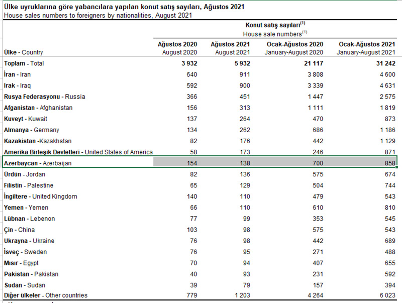 2021-ci ilin yanvar-avqust aylarında (8 ay ərzində) azərbaycanlılar Türkiyədə 858 mənzil alıblar. 2020-cu ilin eyni dövründə azərbaycanlılar Türkiyədə 700 mənzil almışdılar.