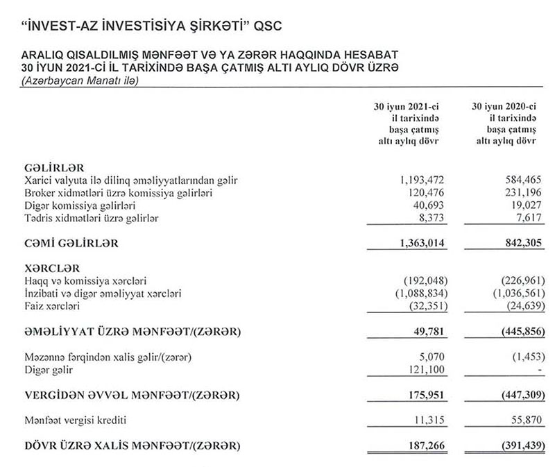 “İnvest-AZ İnvestisiya Şirkəti” QSC 2021-ci ilin 1-ci yarısını (yanvar-iyun dövrünü) 187 min 266 manat xalis mənfəət ilə başa vurub. Halbuki, Şirkət ötən ilin eyni dövrünü 391 min 439 manat zərər ilə bağlamışdı.
