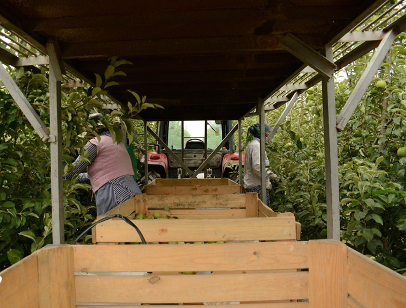 İntensiv bağların becərilməsi ilə yanaşı, yığımı və qablaşdırılması da müasir üsullarla həyata keçirilir. Meyvə toplanan zaman cərgələr arasında kiçikqoşqulu traktor hərəkət edir. Yığılan almalar birbaşa qoşqudakı böyük taralara tökülür. Bu taralar isə soyuducu anbarlara daşınır. Meyvələr bu üsulla toplananda zədə almadığından itki də az olur.