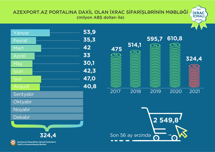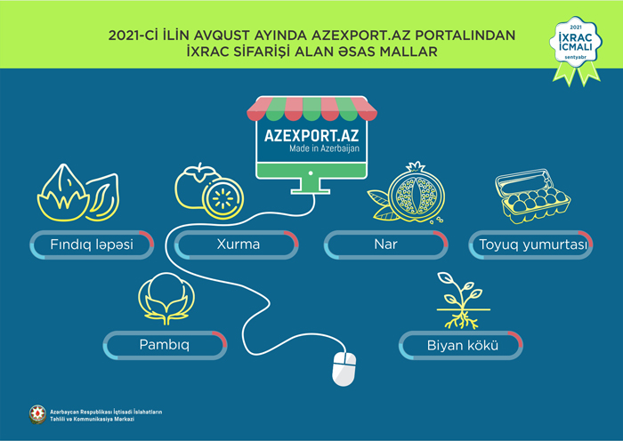2021-ci ilin yanvar-avqust aylarında Azexport.az portalına 324,4 milyon ABŞ dolları dəyərində ixrac sifarişləri daxil olub. 2021-ci ilin avqust ayında Azexport.az portalına daxil olan ixrac sifarişlərinin dəyəri isə 40,8 milyon ABŞ dolları təşkil edib. 2021-ci ilin avqust ayında Azexport.az portalına ən çox ixrac sifarişi pambıq xurma, nar, toyuq yumurtası, fındıq ləpəsi, biyan kökü və s. mallara daxil olub. Məlumat üçün qeyd edək ki, 2017-ci ilin yanvar ayından 2021-ci ilin 31 avqust tarixinə kimi (56 ay ərzində) Azexport.az portalına dünyanın 145 ölkəsindən daxil olan ixrac sifarişlərinin dəyəri 2,54 milyard ABŞ dolları təşkil edib.