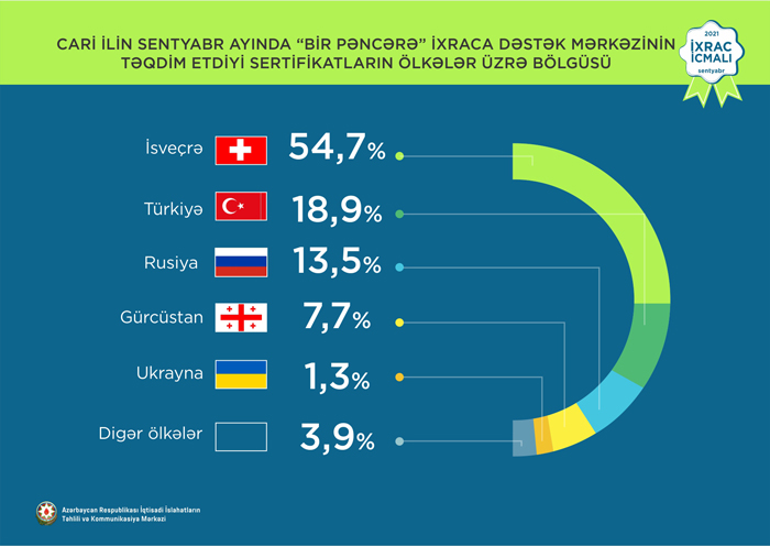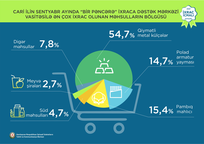 Həmçinin “İxrac İcmalı”nda göstərilib ki, 2021-ci ilin sentyabr ayında “Bir Pəncərə” İxraca Dəstək Mərkəzi vasitəsi ilə həyata keçirilən qeyri-neft ixracının dəyəri 16,7 milyon ABŞ dolları olub. 2017-ci ildən 2021-ci ilin oktyabr ayına qədər “Bir Pəncərə” İxraca Dəstək Mərkəzi vasitəsilə ixrac edilən mal və məhsulların dəyəri 641,7 milyon ABŞ dolları təşkil edib.