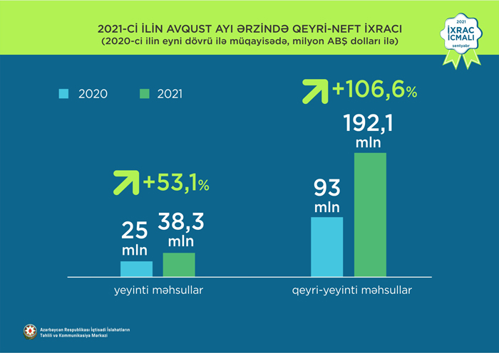 Normallaşma prosesinin davam etdiyi dövrdə avqust ayı üzrə ixrac 1,6 mlrd ABŞ dolları təşkil edib. Qeyri-neft sektoru üzrə ixracda artım 95,3% təşkil etməklə 230,4 mln ABŞ dolları olub. 2021-ci ilin avqust ayı ərzində yeyinti məhsulları üzrə ixrac ötən ilin müvafiq ayı ilə müqayisədə 53,1% artaraq 38,3 milyon ABŞ dolları, qeyri-yeyinti məhsulları üzrə isə 106,6% artaraq 192,1 milyon ABŞ dolları təşkil edib.