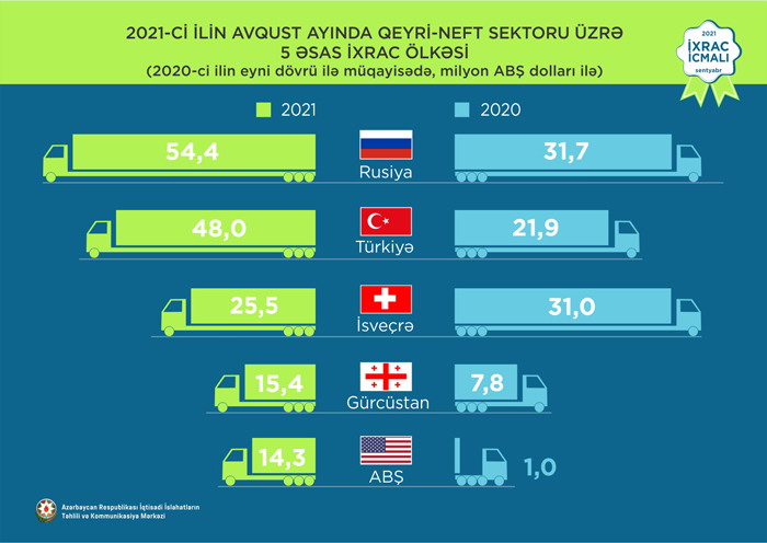 2021-ci ilin yanvar-avqust ayları ərzində Rusiyaya 522,3 milyon ABŞ dolları, Türkiyəyə 407,3 milyon ABŞ dolları, İsveçrəyə 154,9 milyon ABŞ dolları, Gürcüstana 109,5 milyon ABŞ dolları və ABŞ-a 48 milyon ABŞ dolları dəyərində qeyri-neft sektoruna aid mal ixrac olunub.