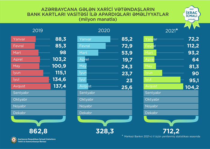 Koronovirus (COVID-19) pandemiyası ilə bağlı yaranmış vəziyyət digər ölkələrdə olduğu kimi, Azərbaycanın da turizm sektoruna təsirsiz ötüşməyib. 2021-ci ilin avqust ayında xarici vətəndaşların bank kartları vasitəsi ilə ölkəmizdə apardıqları əməliyyatların həcmi 104,2 milyon manat təşkil edib. 2021-ci ilin yanvar-avqust aylarında isə əcnəbilər bank kartları vasitəsi ilə 712,2 milyon manatlıq əməliyyat aparıblar.