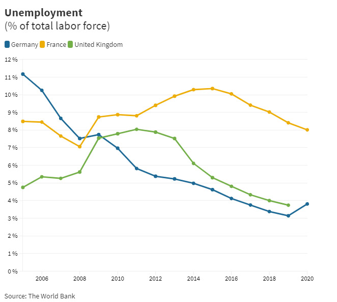 Dünya Bankının rəsmi məlumatına görə, 2005-ci ildə 11,1% təşkil edən işsizlik səviyyəsi 2020-ci ildə 3,8%-ə qədər azalıb. Almaniya Avropada işsizliyin ən aşağı səviyyəsinə malik ölkələrdən biridir. Eurostat bu ilin iyuluna işsizlik səviyyəsinin 36% təşkil etdiyini bildirib. Həmçinin, Merkel 2008 və 2020-ci illərin böhranında “Kurzarbeit” - qısa iş vaxtı sxemi tətbiq edərək, sahibkarların işçiləri tamamilə işdən azad etmək əvəzinə, onların iş saatlarını azaltmasına və beləliklə, milyonlarla iş yerinin saxlanmasına nail olub.