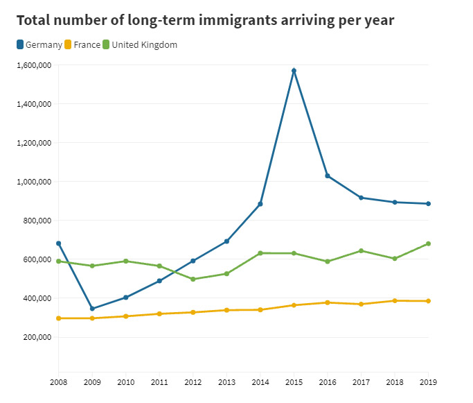 2014-2015-ci illərdə Avropada miqrant böhranı zamanı əksər Avropa ölkələri Suriyada vətəndaş müharibəsi nəticəsində Avropa axın edən qaçqınları qəbul etməkdən imtina etdiyi halda, Merkel 1 milyon qaçqın və miqrantın üzünə Almaniyanın qapılarını açıb. Bu siyasət həm də ölkədə anti-miqrasya əhvallı yaradıb və miqrantlar əleyhinə çıxan Almaniya üçün Alternativ partiyasına müəyyən nüfuz qazandırıb (partiya son parlament seçkilərində 83 yer qazanıb).