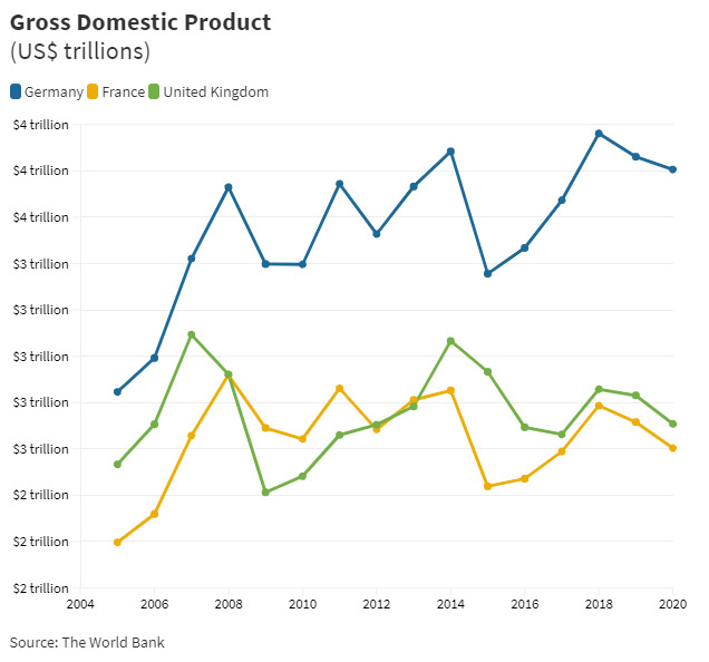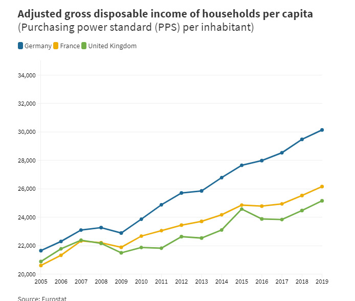 Merkel ölkənin idarəçiliyinə gəldiyi zaman ev təsərrüfatlarının adambaşına xalis gəliri Fransa və Böyük Britaniya kimi digər iri ölkələrdən fərqlənmirdi. Lakin, tədricən artan gəlir 2019-cu ildə 30 min avronu keçib. Böyük Britaniyada bu rəqəm adambaşına 25 155 avro, Fransada isə 26,158 avroya bərabər olub.