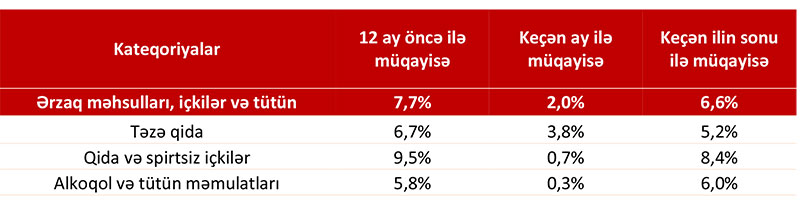 “Veysəloğlu Pərakəndə İndeksi”nə daxil edilən məhsulların qiymətində 2021-ci ilin sentyabr ayında 2020-ci ilin sentyabr ayı ilə müqayisədə 7,7% artım müşahidə edilir. Belə ki, cari ilin sentyabr ayında ötən ilin sentyabr ayı ilə müqayisədə təzə qida məhsullarında (qısa müddətli istifadəyə yararlı istehlak məhsulları) 6,7%, qida və spirtsiz içkilərdə 9,5%, alkoqol və tütün məmulatlarında isə 5,8% artım olub.