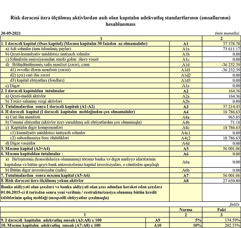 "Bank Melli İran" Bakı filialına 73 milyon 611 min manat nizamanmə kapitalı yatırılsa da yığılmış 35 milyon 268 min manat zərərə görə məcmu kapitalı aşağıdır. 30 Sentyabr 2021-ci il tarixində "Bank Melli İran" Bakı filialı 56 milyon 1 min manat məcmu kapitala malik olub.