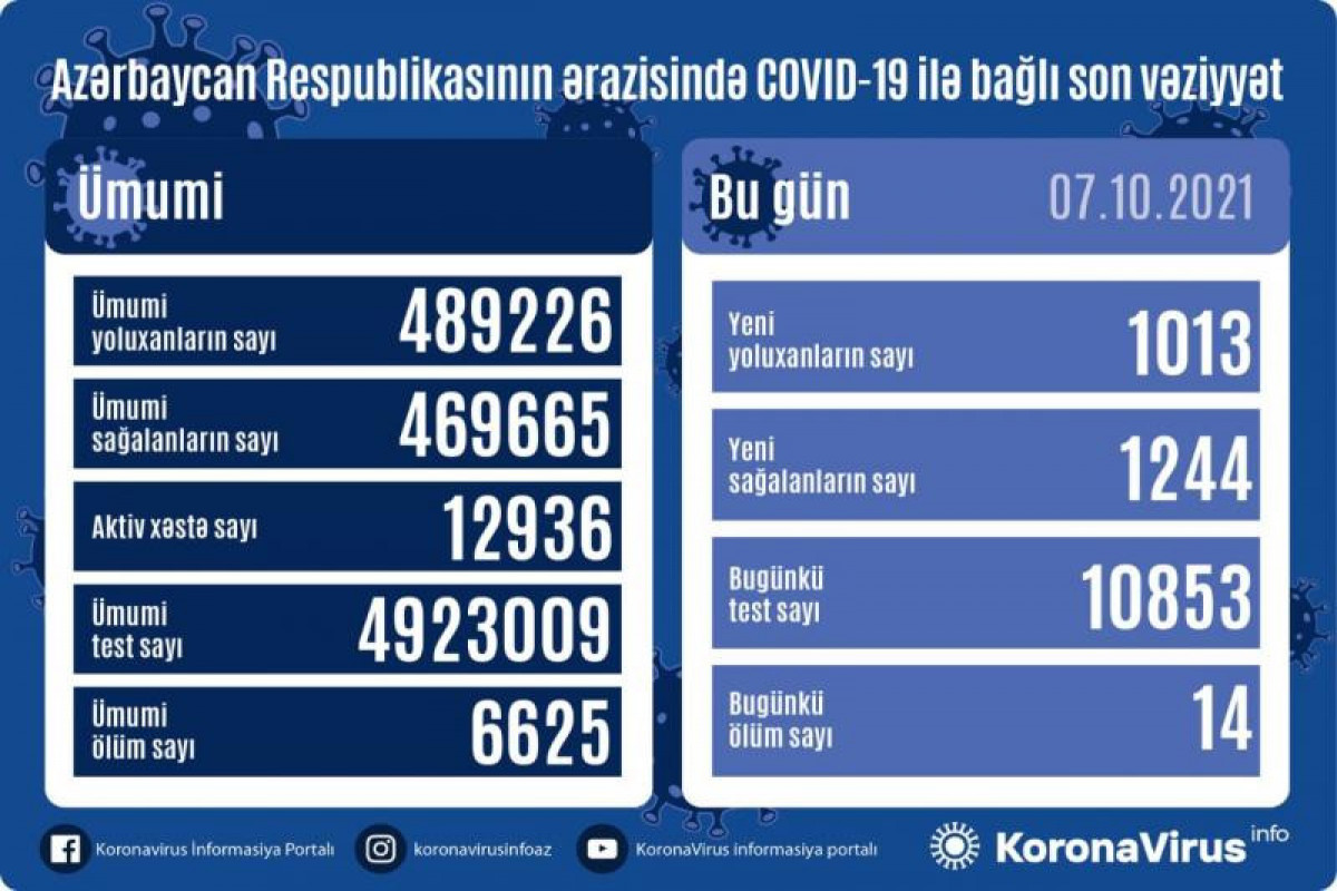 Azərbaycan Respublikasında koronavirus (COVID-19) infeksiyasına 1013 yeni yoluxma faktı qeydə alınıb, 1244 nəfər müalicə olunaraq sağalıb.