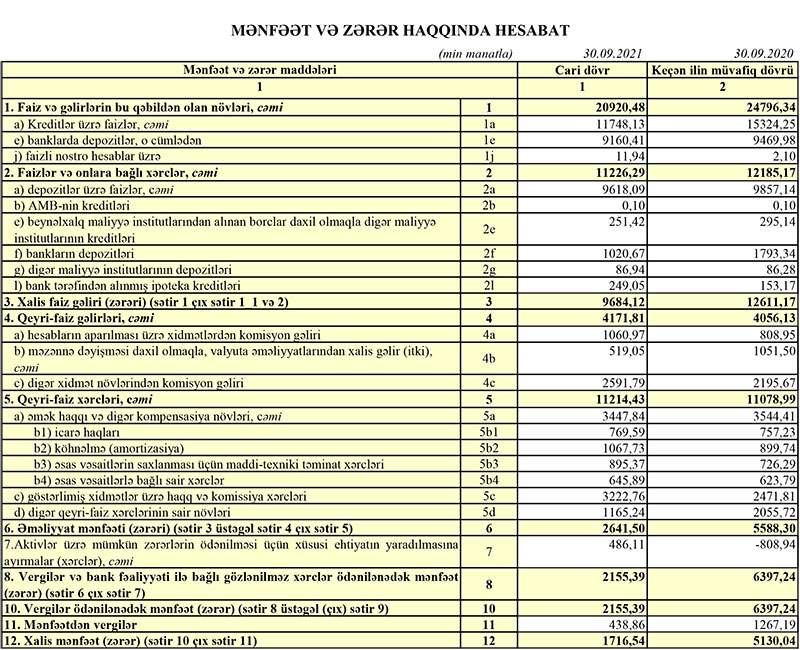 O cümlədən, Bankın 9 aylıq faiz gəlirləri 3 milyon 876 min manat və ya 15,6% azalaraq 20 milyon 920 min manata düşüb, qeyri-faiz gəlirləri isə 116 min manat artaraq 4 milyon 172 min manata yüksəlib.