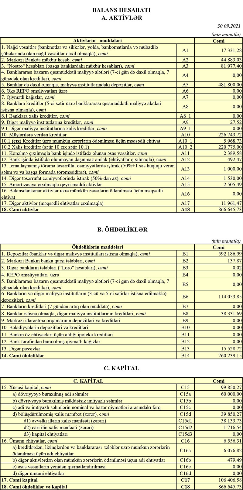 30 Sentyabr 2021-ci il tarixində “Azərbaycan Sənaye Bankı” 101 milyon 337 min manat məcmu kapitala malik olub.