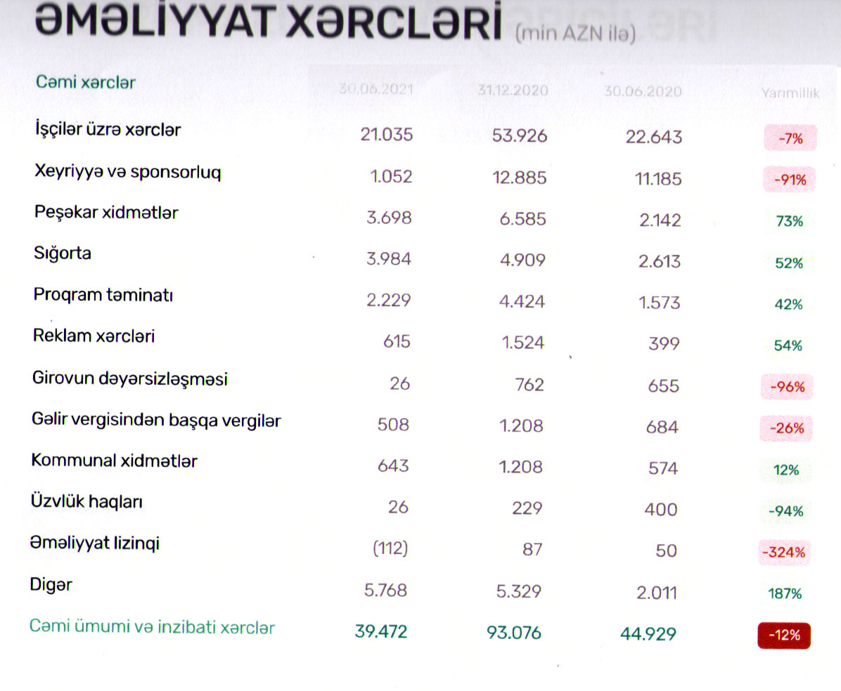 2020-ci ilin ilk 6 ayı ilə müqayisədə 2021-ci ilin ilk 6 ayı ərzində PAŞA Bank-ın cəmi xərcləri 5 milyon 457 və ya 12,1% azal olub.