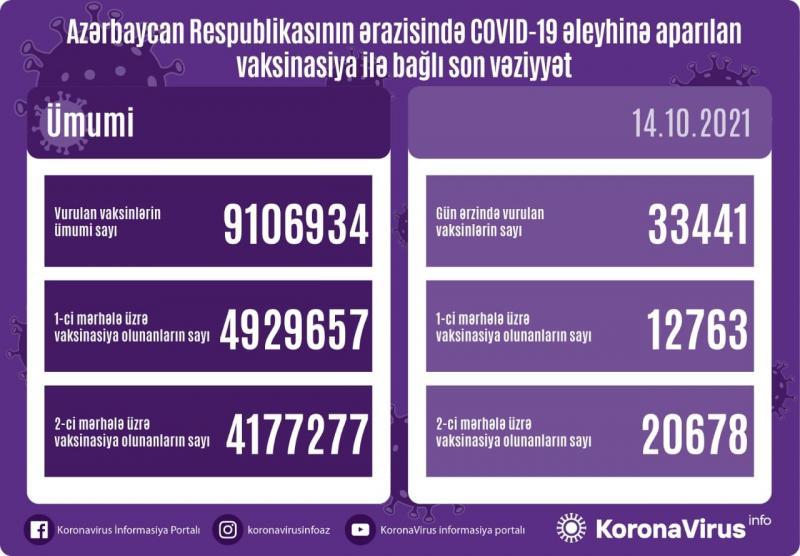 Azərbaycanda son sutkada koronavirus (COVID-19) əleyhinə 33 441 vaksin vurulub. Bir gündə birinci mərhələ üzrə vaksinasiya olunanların sayı 12 763, ikinci mərhələ üzrə vaksinasiya olunanların sayı 20 678 nəfərdir.