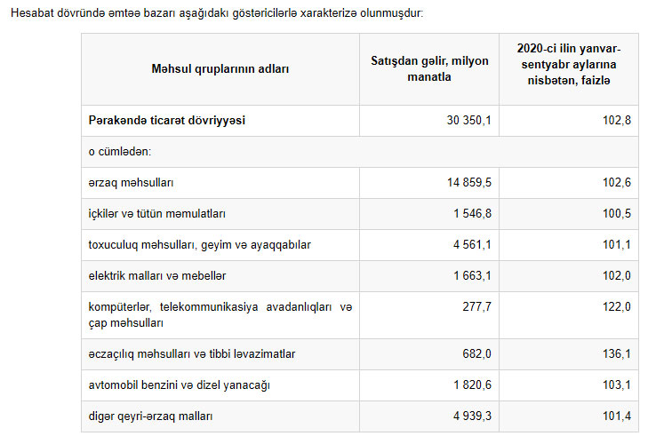 2021-ci ilin yanvar-sentyabr aylarında pərakəndə ticarət şəbəkəsində istehlakçılara 30 milyard 350,1 milyon manatlıq, o cümlədən 16 milyard 406,3 milyon manatlıq ərzaq məhsulları, içkilər və tütün məmulatları, 13 milyard 943,8 milyon manatlıq qeyri-ərzaq malları satılmışdır.