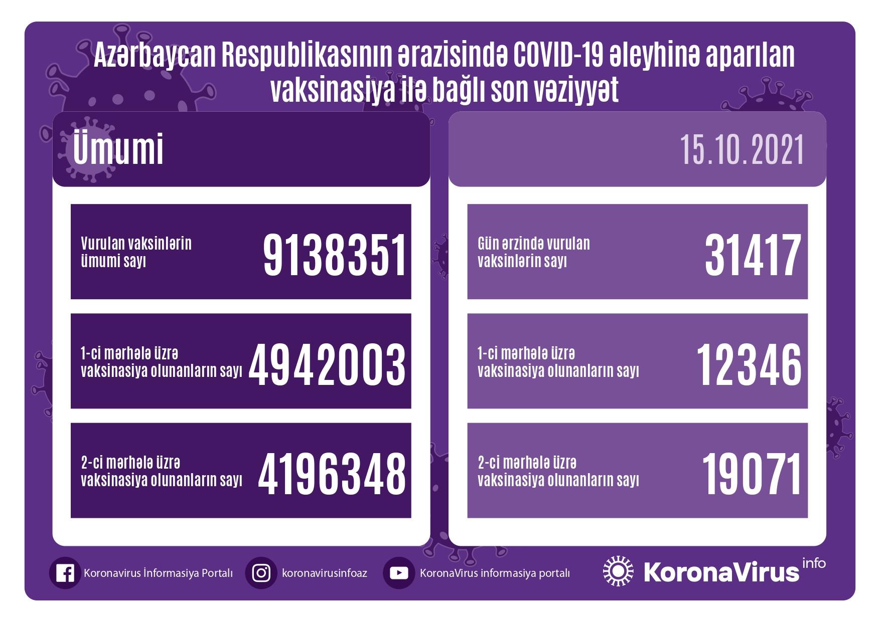 Ölkədə vurulan vaksinlərin ümumi sayı 9 138 351, birinci mərhələ üzrə vaksinasiya olunanların ümumi sayı 4 942 003, ikinci mərhələ üzrə vaksinasiya olunanların sayı isə 4 196 348 təşkil edir.