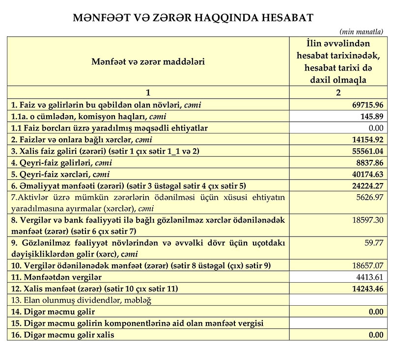 Bank 2021-ci ilin 3-cü rübü ərzində (iyul-sentyabr) xalis mənfəətini 8,4 milyon artıraraq cari ilin 9 ayı üzrə 14,2 milyon manata çatdırıb.