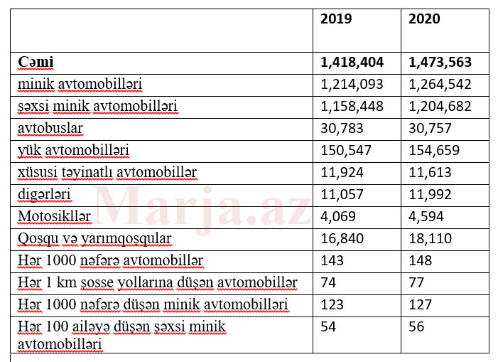 2019-ci illə müqayisədə 2020-ci ildə Azərbaycanda nəqliyyat vasitələrinin sayı 55 min 159 ədəd artaraq 1 milyon 473 min 563 ədədə çatıb. O cümlədən minik avtomobillərinin sayı 50 min 449 ədəd artaraq 1 milyon 264 min 542 ədədə, yük avtomobillərinin sayı 4 min 112 ədəd artaraq 154 min 659 ədədə, motosikllərin sayı 525 ədəd artaraq 4594 ədədə yüksəlib. Avtobusların sayı 26 ədəd azalaraq 30 min 757 ədədə düşüb.