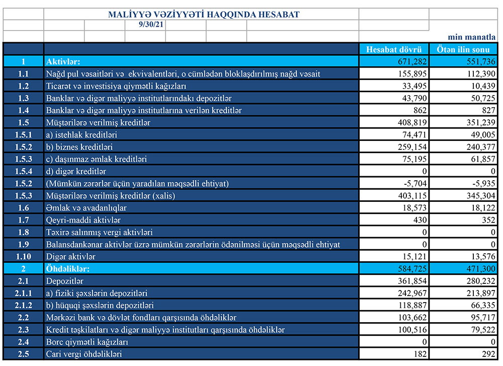 Bankın xalis kredit portfeli (mümkün zərərlər üçün yaradılan məqsədli ehtiyat xaric portfel) 57 milyon 811 min manat artaraq 403 milyon 115 min manata çatıb. Mümkün zərərlər üçün yaradılan məqsədli ehtiyat isə 231 min manat azalaraq 5 milyon 704 min manata düşüb.