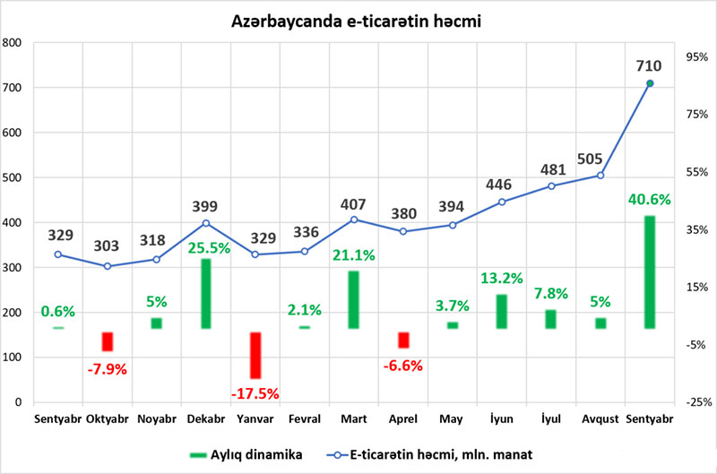 Bu ilin sentyabr ayında Azərbaycan əhalisi tərəfindən bank kartları ilə elektron ticarət (e-ticarət) şəbəkəsində 710 milyon manat həcmində ödəniş həyata keçirilib. Bu, indiyədək qeydə alınan ən yüksək aylıq göstəricidir. Bundan əvvəlki rekord avqustda qeydə alınıb – 505 milyon manat.