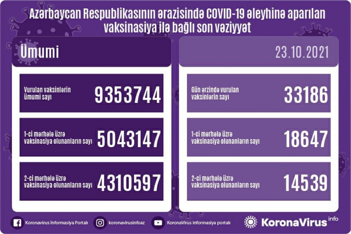 Ölkədə vurulan vaksinlərin ümumi sayı 9353744, birinci mərhələ üzrə vaksinasiya olunanların ümumi sayı 543147, ikinci mərhələ üzrə vaksinasiya olunanların sayı isə 4310597 təşkil edir.