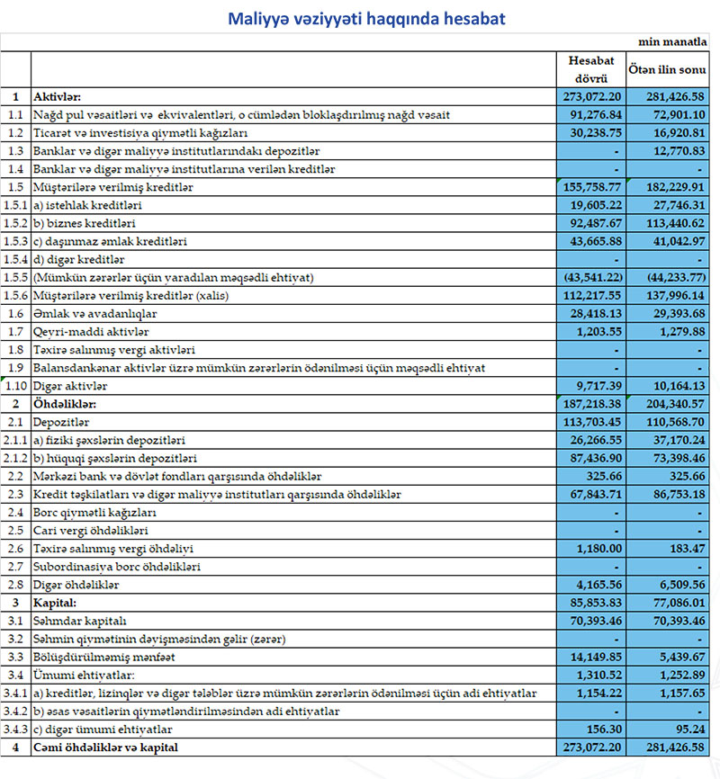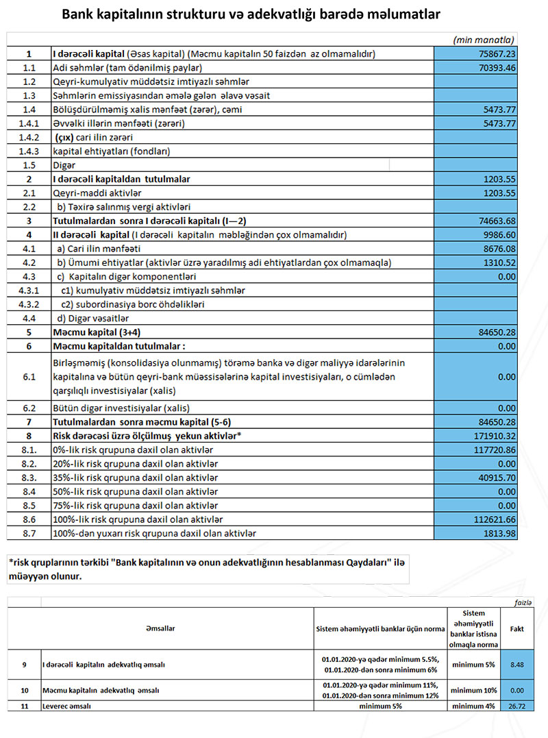 Qeyd edilib ki, Bankın məcmu kapitalı 84,7 milyon manat təşkil edir.