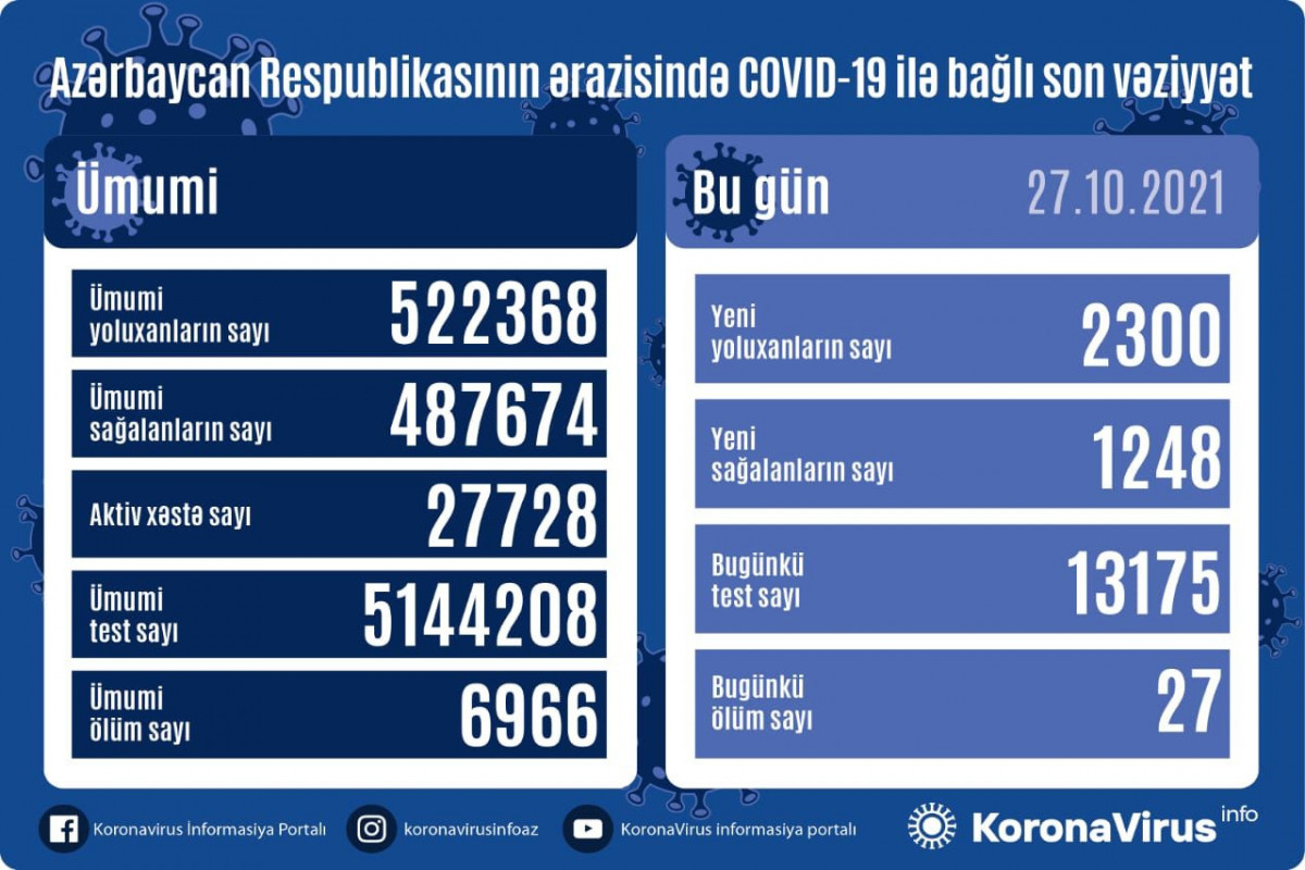 Nazirlər Kabineti yanında Operativ Qərargahdan verilən məlumata görə, COVID-19 üçün götürülən analiz nümunələri müsbət çıxmış 27 nəfər vəfat edib.