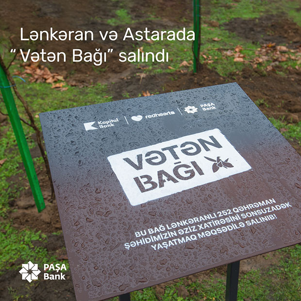 “Red Hearts” xeyriyyə fondunun təşkilatçılığı və PAŞA Bankın dəstəyi ilə vətənimizin müdafiəsində canından keçmiş oğullarımızın xatirəsini əbədiləşdirmək üçün bir çox rayonlarda artıq yaradılmış Vətən Bağı layihəsini bu dəfə Lənkəran və Astarada da davam etdirilib.