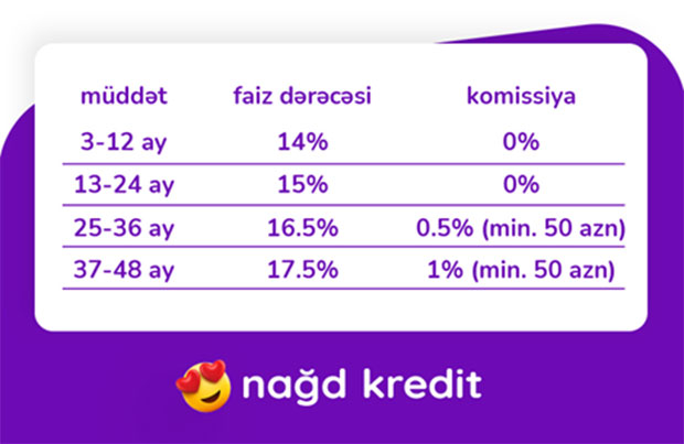 Kampaniya ərzində 3 aydan 12 ay müddətinədək rəsmiləşdirilən kreditlərin illik faiz dərəcəsi 14% olacaqdır.