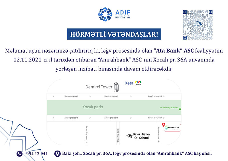 Əmanətlərin Sığortalanması Fondu bildirir ki, ləğv prosesində olan "ATA BANK" ASC fəaliyyətini 02.11.2021-ci il tarixdən etibarən “Amrahbank” ASC-nin inzibati binasında fəaliyyətini davam etdirəcəkdir.